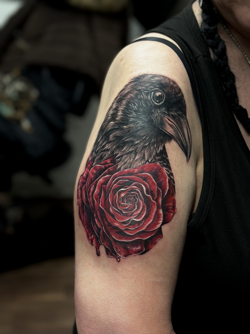 Read moreRealistic black and grey raven with red rose cover up tattoo on upper arm by Esther at Unicorn Tattoo Art Collective, Ashford Surrey
