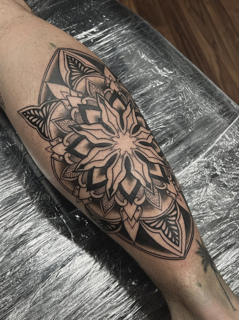 A detailed mandala leg tattoo created by Esther at Unicorn Tattoo Art Collective. This geometric black and grey mandala piece was tattooed on the calf in a single session, featuring precise line work, smooth shading and strong symmetry that flows naturally with the shape of the leg.