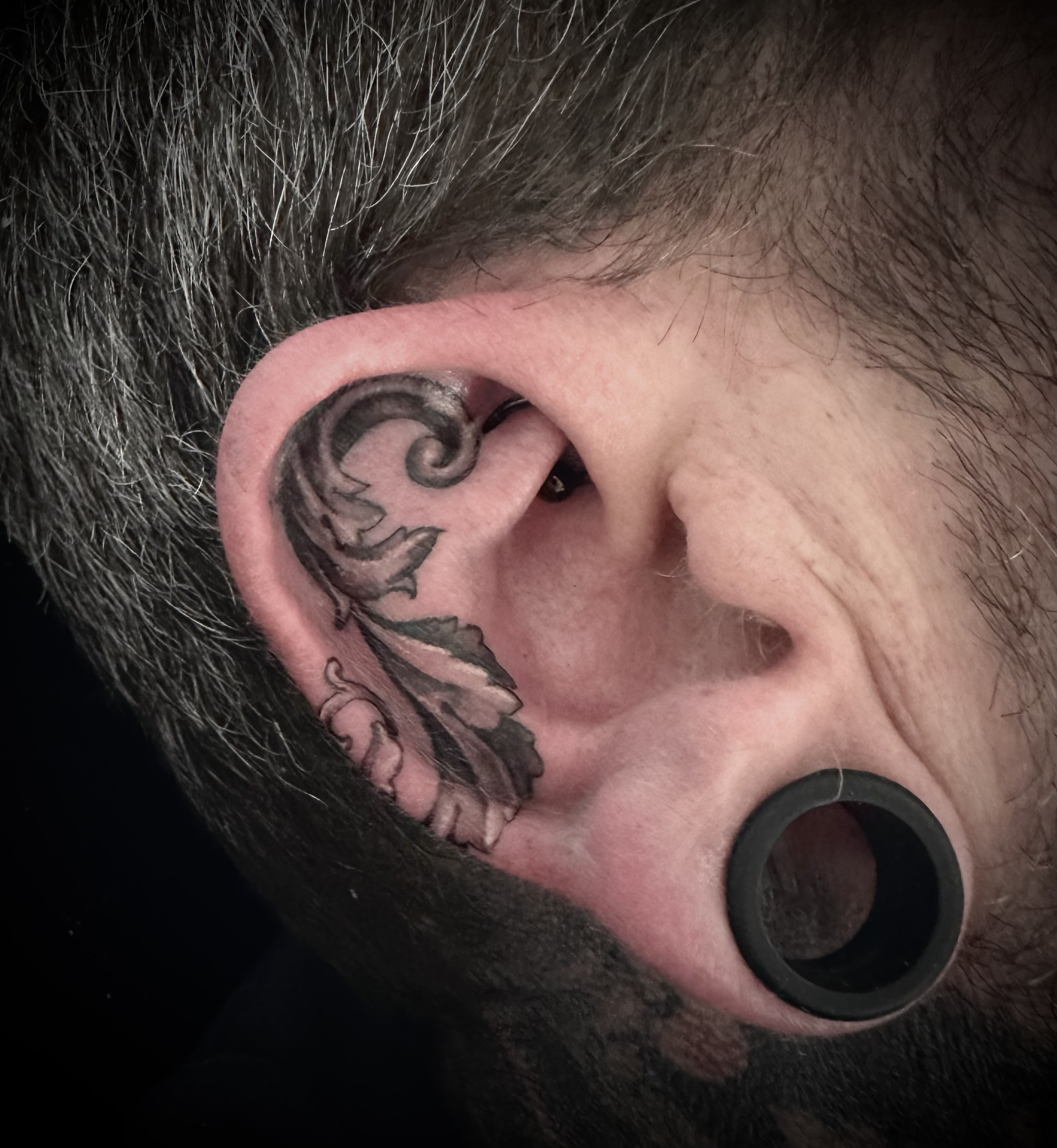 Filigree Fine Line Ear Tattoo – Custom Black and Grey Design Ashford Surrey