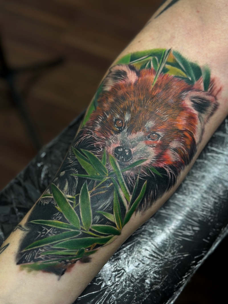 Professional cover-up tattoo featuring photorealistic red panda with vibrant bamboo leaves, expertly designed to completely conceal previous unwanted tattoo work. Created by Esther – Surrey's leading cover-up tattoo artist and realism specialist at Unicorn Tattoo Art Collective.
