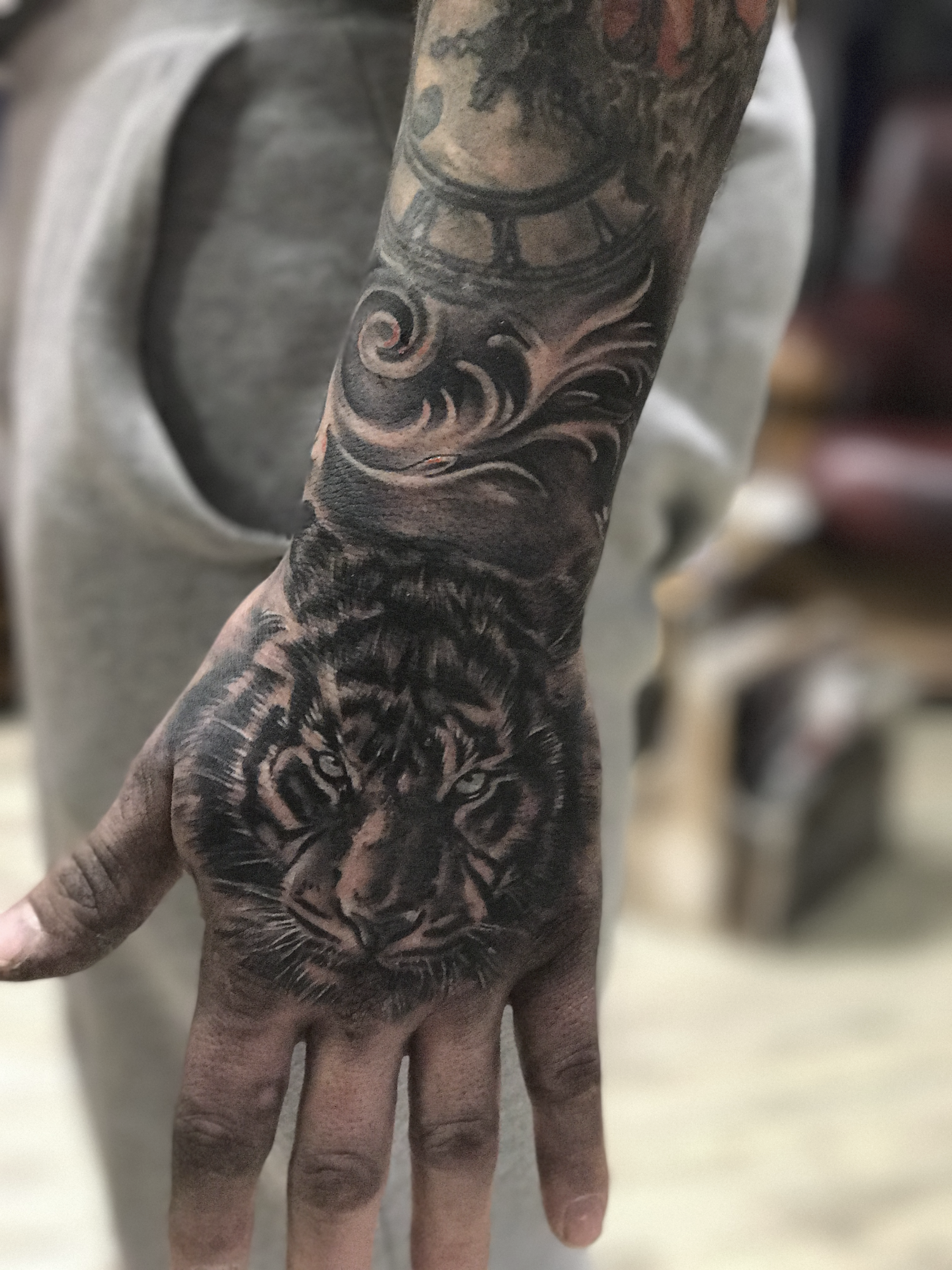 Tiger on hand animaltattoos realistic blackandgrey animalportrait